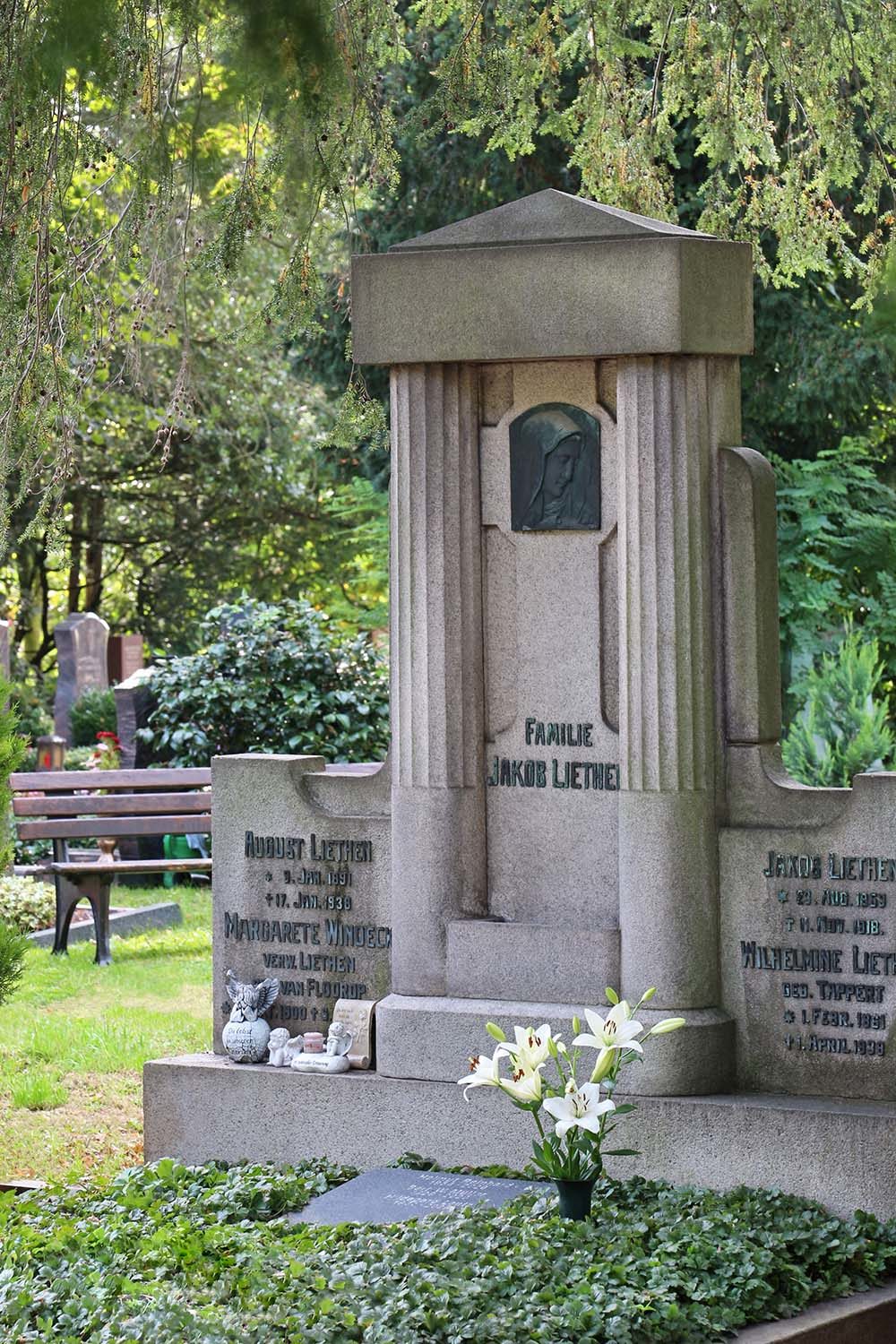 Urnengemeinschaftsgrab. Ein ehemaliges Familiengrab mit historischen Grabdenkmal, dient nun als würdevoller Ort für Urnenbeisetzungen.
