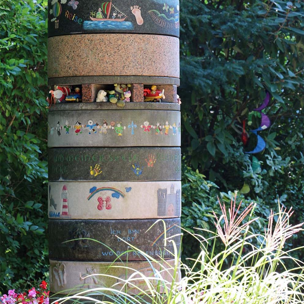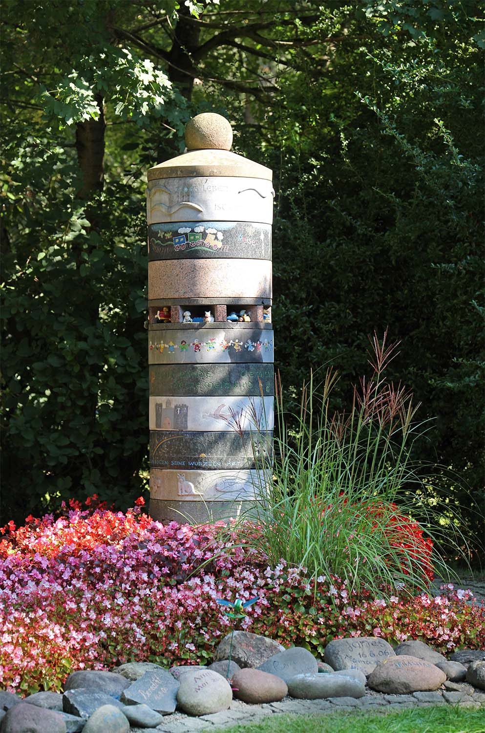 Bunte Windräder, Porzellan-Engel, kleine Spielzeuge und Stofftiere schmücken die Grabstellen auf dem Frühchen-Feld. Ein Grabmal in der Mitte des Feldes hat die Form eines Schmetterlings, am oberen Ende ragt eine Gedenksäule aus zehn Steinringen empor, alle sind mit kindlichen Motiven verziert.